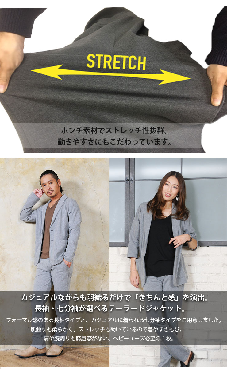 モデル:mens GOKU 170cm 62kg/ladys rena 168cm 47kg 素材:ポリエステル 65% 綿 35% カラー: ブラック・ネイビー・グレー・チャコール【商品詳細】 流行や着る年代を問わない王道アウター・テーラードジャケットが登場です。