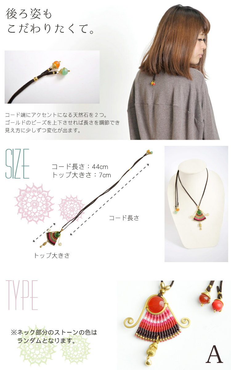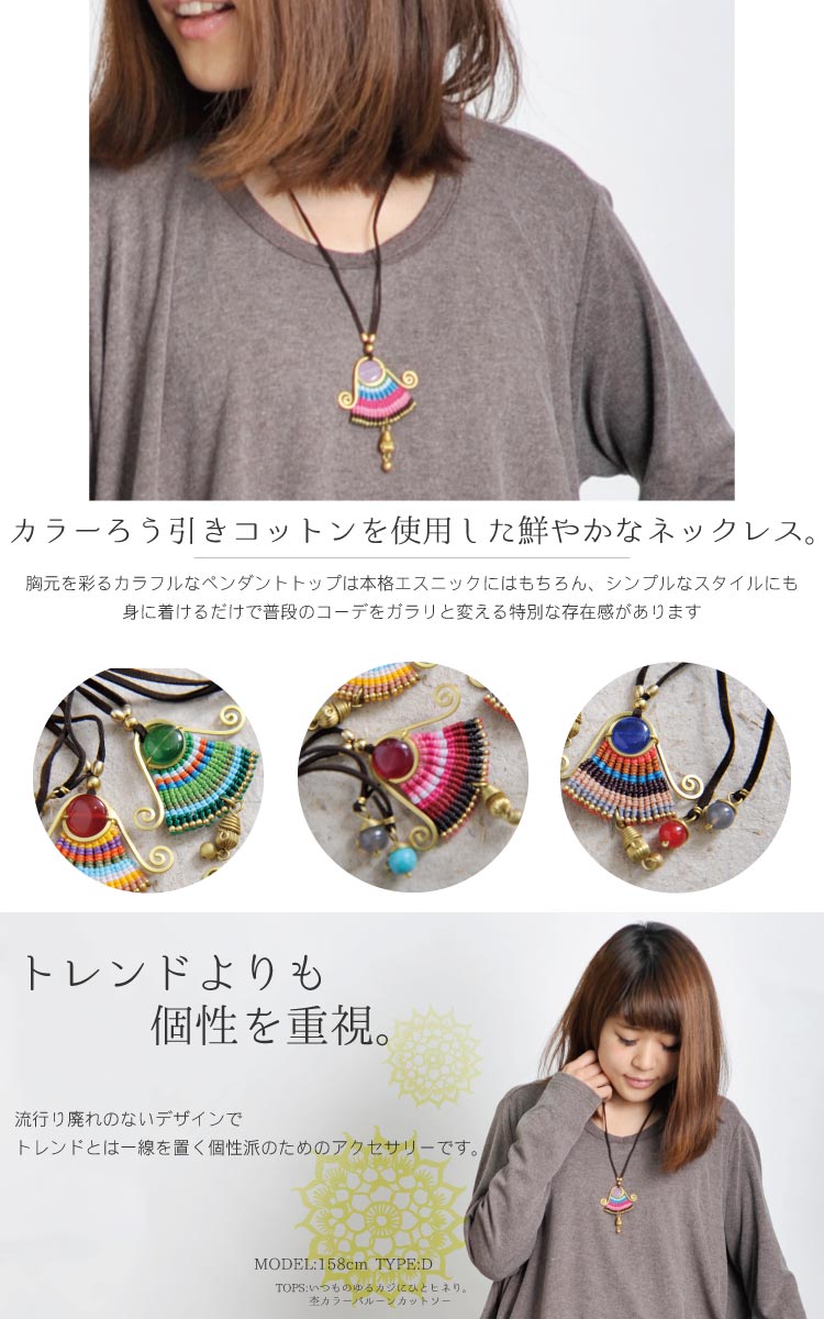 胸元を彩るカラフルなペンダントトップは本格エスニックにはもちろん、シンプルなスタイルにもよく映え、身に着けるだけで普段のコーデをガラリと変える気分が変わり特別な存在になります。